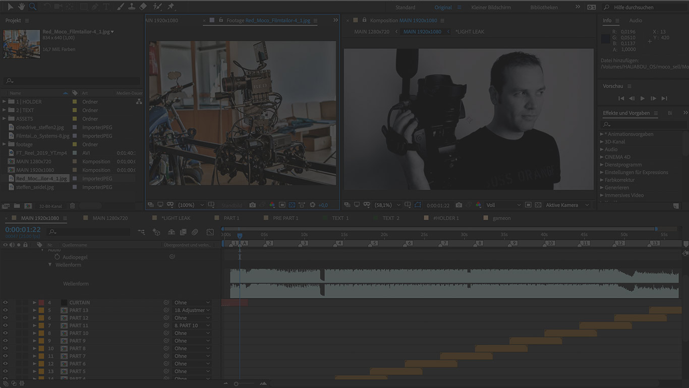 Motion Graphics, Info Graphics, Character Animation, Logo Animation, Typo Animation, Screen Animation, Stop-Motion, Stop-Trick, Postproduction, Project Adjustment, Background Animation, Color Correction, Keying, Rotoscoping, Subtitling, Revealer, Transitions, Run and gun, Timeplapse, Greenscreen, DVD Authoring, Motion Visual